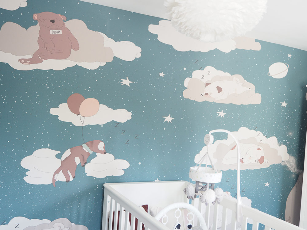 The nursery features one statement wall where one of the dogs has been personalised to the colour of the family dog with a collar featuring its name.